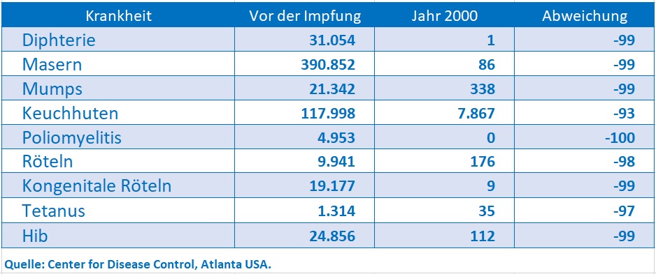 Infektionskrankheiten – nicht Impfstoffe – sind potenzielle Waffen der Massenvernichtung. Im Falle von Bioterrorismus besteht die Gefahr, dass tödliche Bakterien und Viren zu kriegerischen Zwecken eingesetzt werden. Impfstoffe hingegen werden genau dafür entwickelt, um diesem Risiko entgegenzuwirken. Auch hier genügt ein Blick auf die nächste Tabelle, um zu sehen, wie Impfstoffe einige der wichtigsten Infektionskrankheiten ausgerottet oder drastisch reduziert haben – und somit zu den bedeutendsten Errungenschaften zählen, die die Gesundheit der Menschheit verbessert haben.